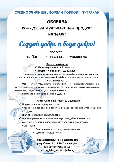 Учениците на СУ „Йордан Йовков“ вложиха своя творчески талант в стихове, разкази и есета и участваха с творбите си в литературния конкурс по повод Патронния празник на нашето училище. Темата „Създай добро и бъди добро“ не е случайна, изборът ѝ е провокиран от идеята за добротворството, която е централна в творчеството на хуманиста и учителя по житейска мъдрост Йордан Йовков. Оценяването на конкурсните творби беше поверено на Елка Стоянова, Венета Александрова и Теменужка Савова, а отличените участници награди директорът на училището Анка Атанасова. Благодарности отправяме към Алпер Шедат и Преслава Маркова – водещи на награждаването.